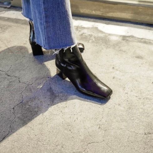 トレンドのスクエアトゥのショートブーツ。